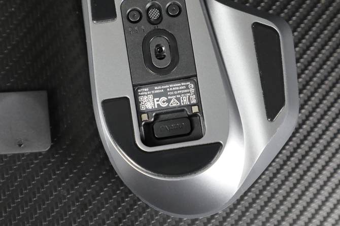 底部的磁吸仓,雷柏MT760还为我们设计了隐藏惊喜,那就是支持P3无线充电模块,这款鼠标将会秒支持无线充电,只要是Qi协议的无线充电设备都能为这款鼠标进行充电。