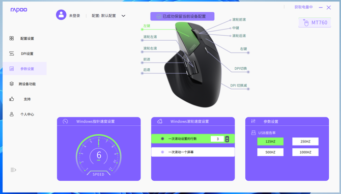 后续在性能方面,我们可以使用驱动进行按键的自定义设置,并且顶部的按键和底部的圆形按键,默认是DPI切换按键,默认800-4000的7档调节,侧键则是前进后退,比较常规,传感器方面,雷柏MT760使用了原相3220,兼顾高性能和低能耗。