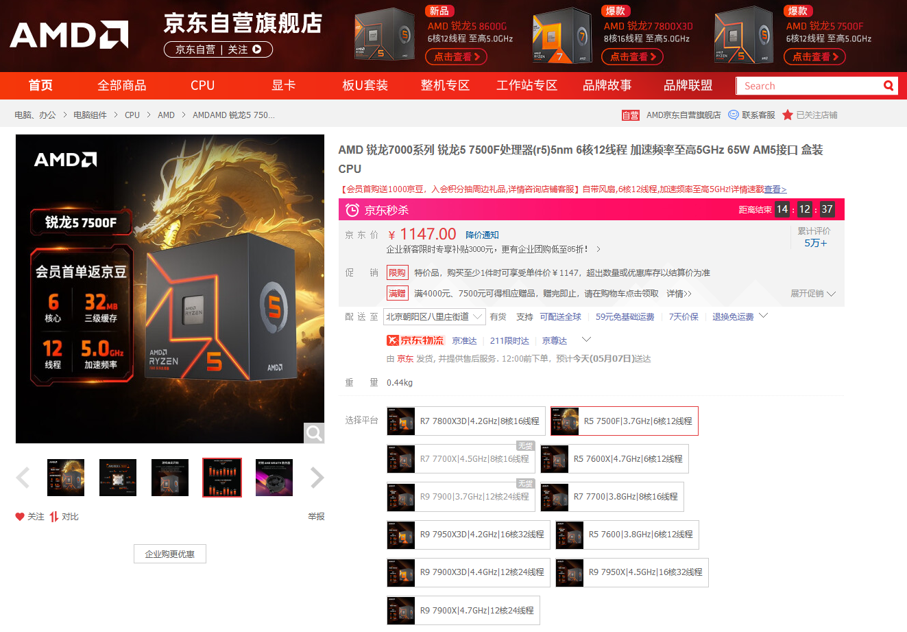 AMD 锐龙5 7500F京东购买链接: