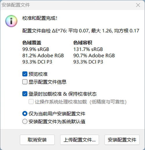 官方宣称这块屏幕达到100%sRGB的高色域覆盖,经过我们的实际测试,可以看到这款屏幕的达到99.9%的sRGB色域覆盖,以及93.3%的DCI-P3高色域,支持8bit 1670万色的显示,完全能够满足绝大部分的后期调色和日常使用,在色彩精度方面,经过我们实测,显示器的∆E平均为0.07,最大仅为1.26,均方根仅为0.17,达到专业级显示器的色彩精度表现,色彩表现非常出色
