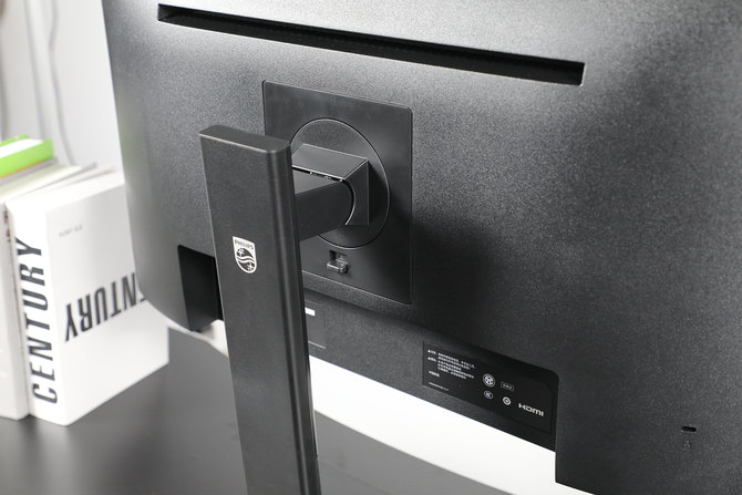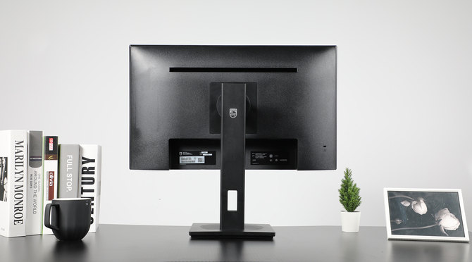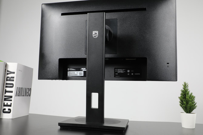 飞利浦245S9RB的背面设计同样采用黑色的简洁、商务风设计,看上去整体非常简洁,支架也是支持升降、旋转、俯仰角调节,满足用户的实际使用要求。
