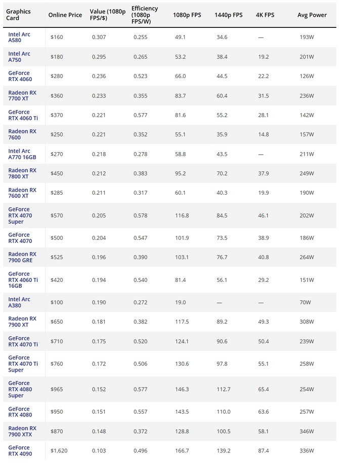 排在最后的反而都是高端显卡,像是GeForce RTX 4080 Super、Radeon RX 7900 XTX、GeForce RTX 4090,但是高达1620 美元的售价,不是谁都能消费得起的,所以,对于更多普通消费者,肯定最终还是忠于高性价比。