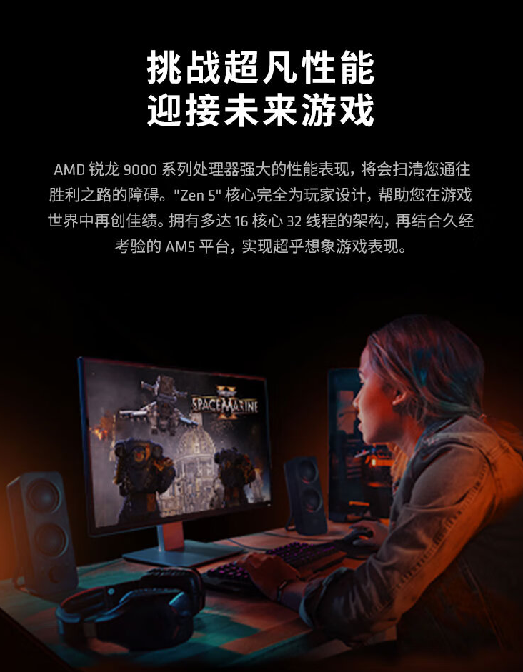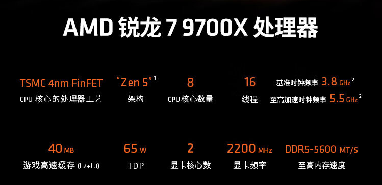 AMD 锐龙7 9700X处理器是锐龙9000系列处理器中最 符合主流游戏玩家的一款产品,它不仅可以胜任《黑神话:悟空》这样的3A大作,也能通杀目前国内流行的竞技网游。而且AMD 锐龙9000系列处理器适用于AM5插槽,支持PCIe 5.0和DDR5内存,玩家们直接就进入了AM5时代,AMD最 新承诺这一代至少可以用到2027年+,后续更多游戏大作面世,大家有提升性能需求的话,只要购买新的处理器即可,让大家放心“战未来”!
