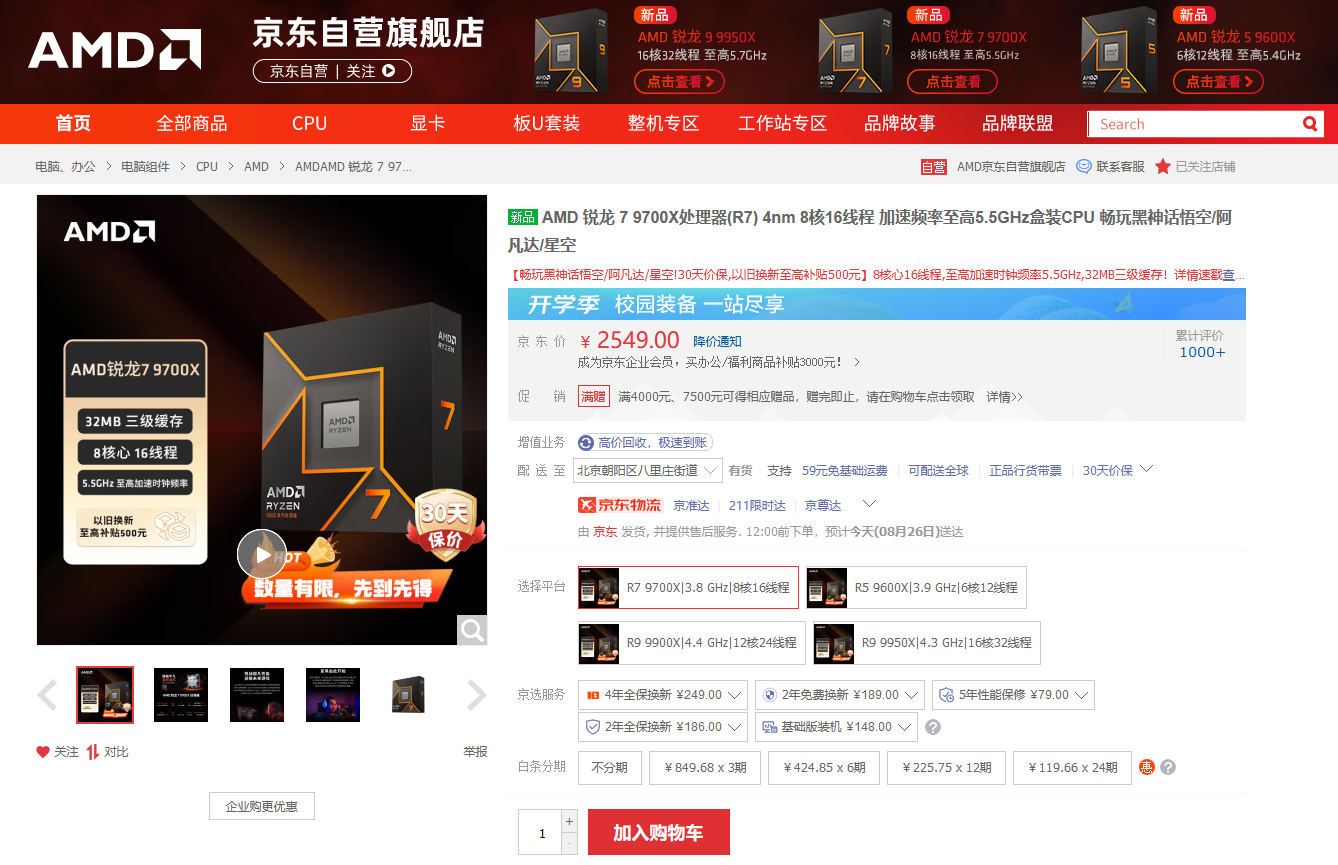 目前AMD 锐龙7 9700X处理器在京东自营旗舰店的首发报价是2549元,目前现货已经补齐,大家可以放心购买,新品首发期有晒单返京东E卡的主要活动,同时可参与白条6期免息和以旧换新享至高500元补贴,而30天京东价保让大家无惧降价,成为京东旗舰店会员还有首购返京豆和多重会员福利可享。