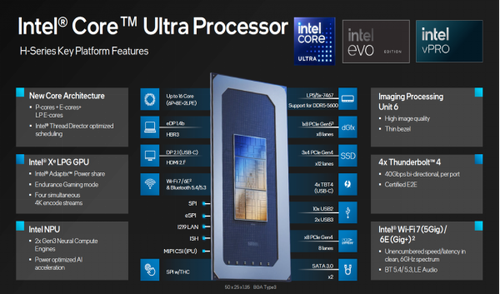 Meteor Lake最 高提供 6+8+2 核心。集成了全新的 Xe LPG 的引擎,集显上有了性能提升。模块化设计的低功耗岛内置 NPU,支持 Wi-Fi 6E 以及最 新的 Wi-Fi 7 无线网卡,同时内置了图象处理单元。