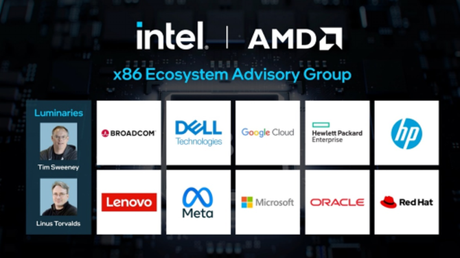 图注:英特尔与AMD联合成立x86生态系统顾问小组,汇聚行业技术领袖Linus Torvalds和Tim Sweeney,以及众多伙伴作为创始成员加入其中,包括博通、戴尔、谷歌、慧与科技、惠普、联想、Meta、微软、甲骨文和红帽。(来源:英特尔公司)