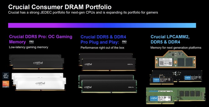 Crucial拥有丰富的消费级DRAM产品线,从支持超频、低延迟的游戏内存Crucial DDR5 Pro,到即插即用型的高性能内存DDR5&DDR4,再到高效能、低功耗、小巧便捷的LPCAMM2 DDR5&DDR4内存,无一不彰显出Crucial对消费者需求的精准把握和深刻理解。这些产品能够满足不同用户群体的多样化需求,无论是游戏爱好者、专业设计师还是普通家庭用户,都能找到适合自己的内存解决方案。