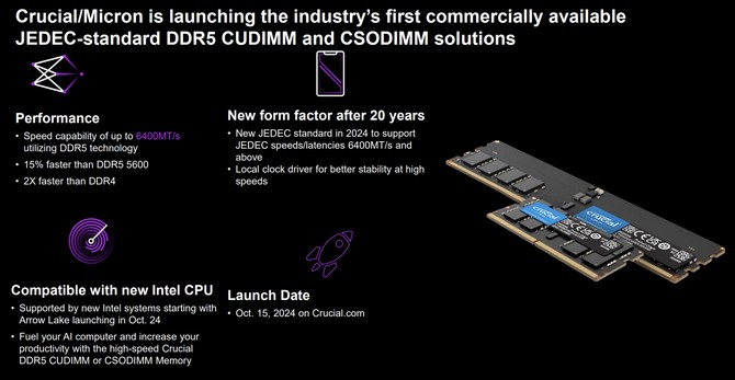 然而,Crucial并没有止步于现有的产品线。随着技术的不断进步,CUDIMM/CSODIMM作为新一代内存模块应运而生。这些新模块预计在2024年推出新JEDEC标准,将支持更高的速度和更低的延迟,并具备本地时钟驱动器以提高高速下的稳定性。这些特性使得CUDIMM/CSODIMM在性能上远超传统的UDIMM和SODIMM内存模块,成为未来计算系统的重要组成部分。