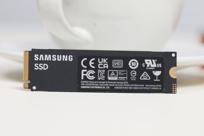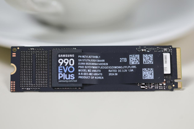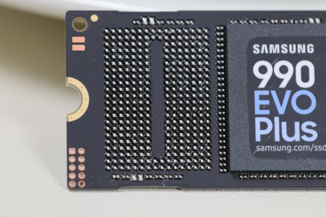 拿掉上面的贴纸我们可以看到,三星990 EVO Plus采用了使用了全新的三星自研控制芯片,存储颗粒则为三星的第8代V-NAND颗粒,顺序读写分别达到7250MB/S和6300MB/s,随机读写可以达到1000K iops和1350K iops,和此前的三星990 EVO相比较,顺序读取性能提升了45%,并且这款硬盘同样支持PCIe 5.0*2和PCIe 4.0*4协议,并且向下兼容PCIe 3.0技术。