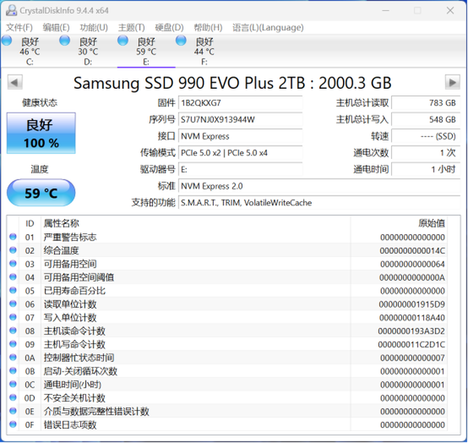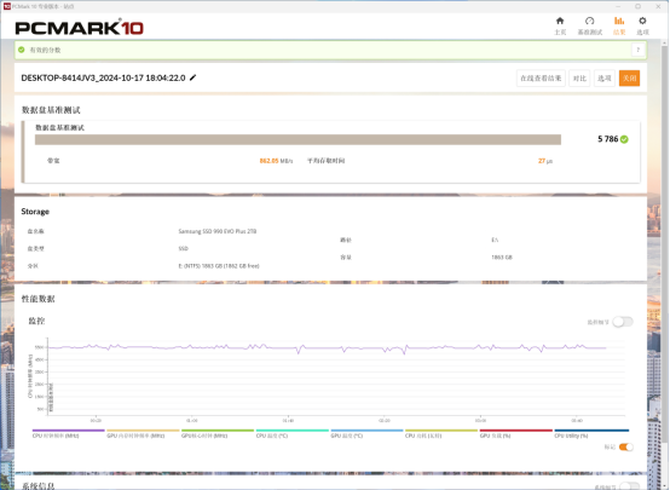 PCMARK 10的数据盘基准测试中,三星990 EVO Plus的综合得分达到5786,带宽为862.05MB/s,平均存取时间为27us,能够轻松胜任目前市面上绝大部分的使用场景。
