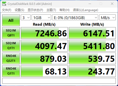 首先是CrystalDiskMark 8.0的测试,经过实际测试可以看到,三星990 EVO Plus的顺序读写分别为7246.86MB/s和6147.51MB/s与标称的速度非常相近。