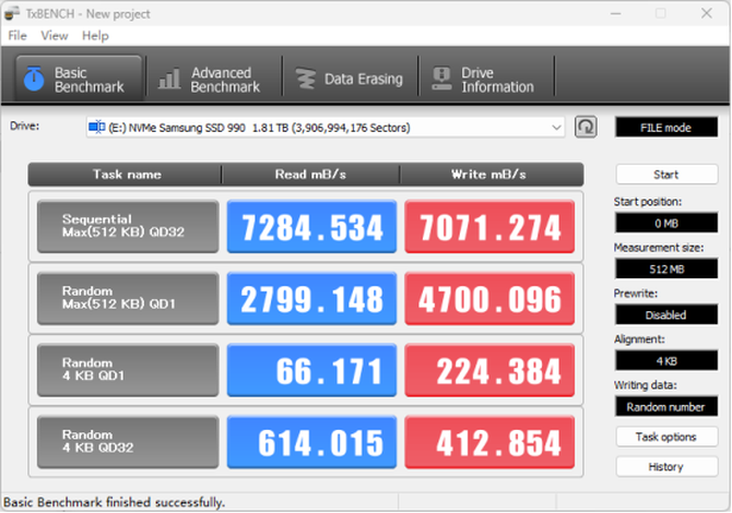 TxBench测试中,这款硬盘的顺序读写分别为7284MB/s和7071MB/s,性能表现优秀。