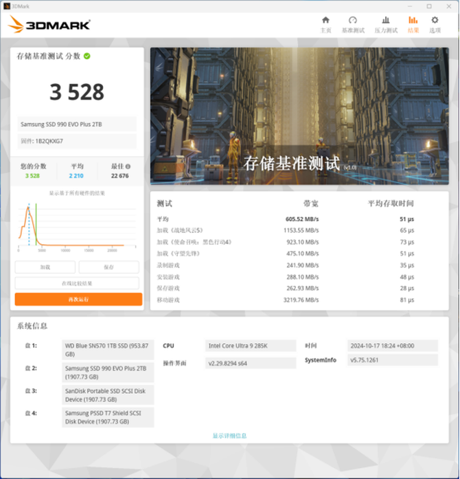 3DMARK基准测试中,三星990 EVO Plus的综合得分为3528,平均带宽为605.52MB/s,对于绝大部分的游戏玩家来讲,这款游戏不论是游戏过程、载入、解压缩、直播、录像等操作上,都能提供丝滑流畅且稳定的游戏体验。