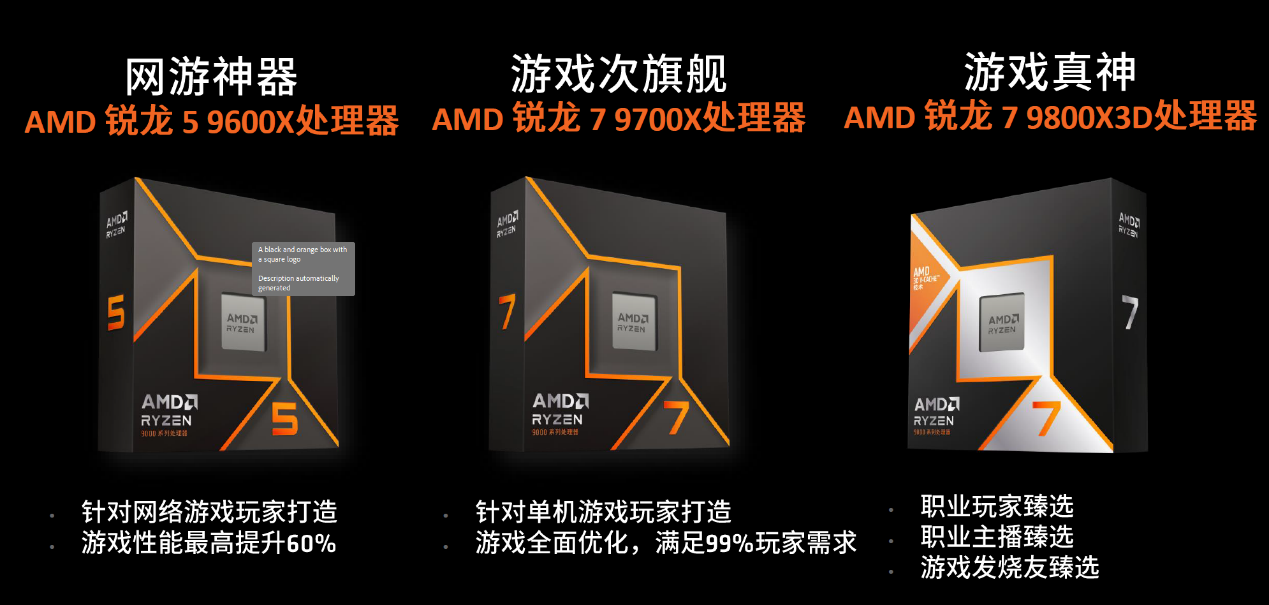 这两款处理器虽然价格实惠,但性能却十分强悍。它们不仅可以让大家畅玩《黑神话:悟空》这样的3A大作,更是通杀目前国内主流竞技网游。锐龙5 9600X处理器采用了TSMC 4nm FinFET工艺制程的ZEN5架构,搭配6核心12线程的配置和高达5.4GHz的最 高频率,总计38MB的游戏缓存和65W的功耗设计专为主流游戏玩家打造。而AMD 锐龙7 9700X处理器则搭配8核心16线程的配置和高达5.5GHz的最 高频率,适合高阶玩家使用。AMD 锐龙9000处理器适用于AM5插槽,支持PCIe 5.0和DDR5内存,AMD承诺这一代至少可以用到2027年+,大家可以放心战未来。