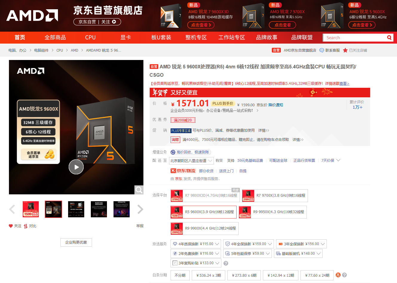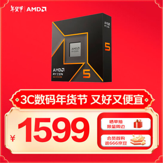 目前AMD 锐龙5 9600X处理器在京东自营旗舰店的日常报价是1599元, PLUS会员还能享受到年货节的补贴,到手更优惠,而大家购买之后还可以参与晒单抽周边壕礼的活动(指定型号前往页面查看),成为京东旗舰店会员还有首购返666京豆和积分抽大奖活动。目前AMD 锐龙5 9600X处理器处于日常低价,当然限时的优惠券不定时掉落,大家可以关注好产品,在最 优惠的时候下单。