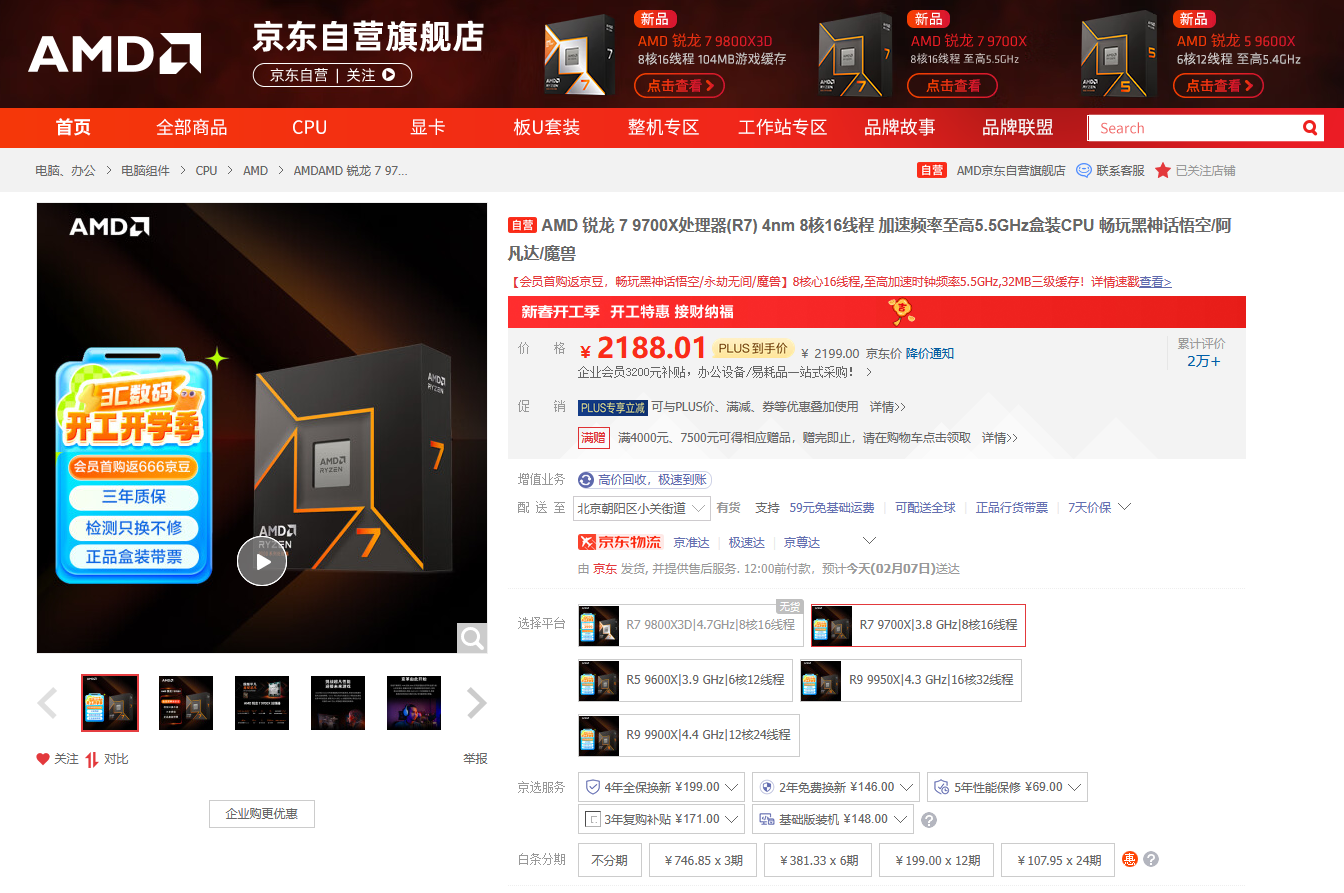 目前AMD 锐龙7 9700X处理器在京东自营旗舰店的报价是2199元,京东PLUS会员到手还能再优惠。同时大家购买之后可参与晒单抽周边壕礼的活动(指定型号前往页面查看),成为京东旗舰店会员还有首购返666京豆和积分抽大奖活动。目前AMD 锐龙7 9700X处理器处于3C数码开工开学季低价,想要在2025乙巳蛇年高效开局的朋友,相信锐龙7 9700X就是您最 好的选择。