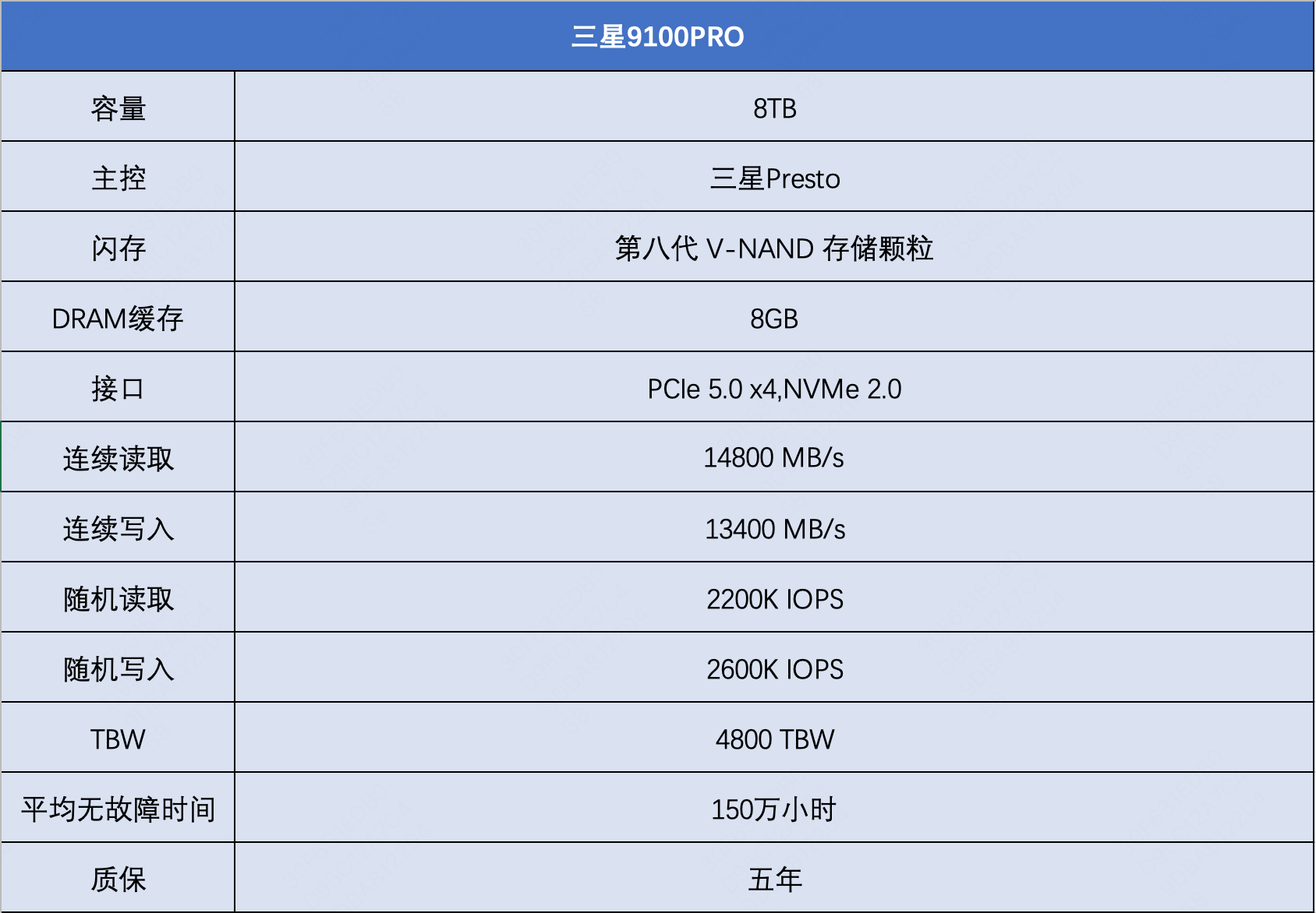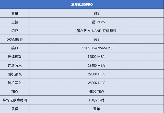 在硬盘性能上,三星 9100 PRO 的规格参数十分突出:顺序读取速度可达 14,800 MB/s,顺序写入速度可达 13,400 MB/s;随机读写速度更分别高达 2,200K IOPS与 2,600K IOPS。这一性能水平已接近 PCIe 5.0 x4 通道的理论速率上限,而这样的亮眼成绩,归功于三星第八代 V-NAND 存储颗粒与基于 5nm 制程的自研 Presto 主控。