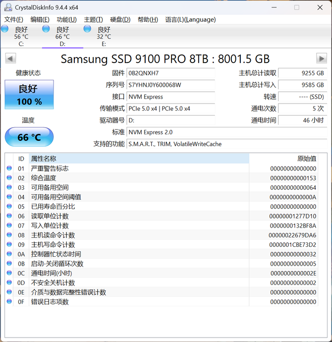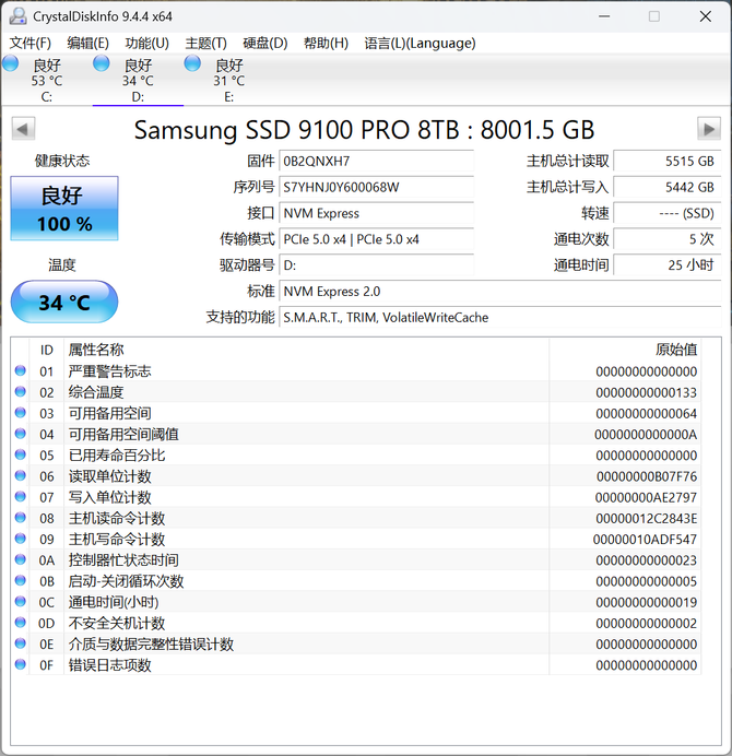 通过CrystalDiskInfo读取硬盘基础信息:支持PCIe 5.0 x4与NVMe 2.0标准,固件版本0B2QNXH7,支持S.M.A.R.T、TRIM功能。