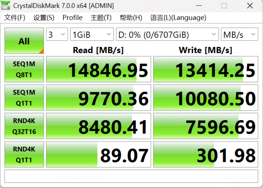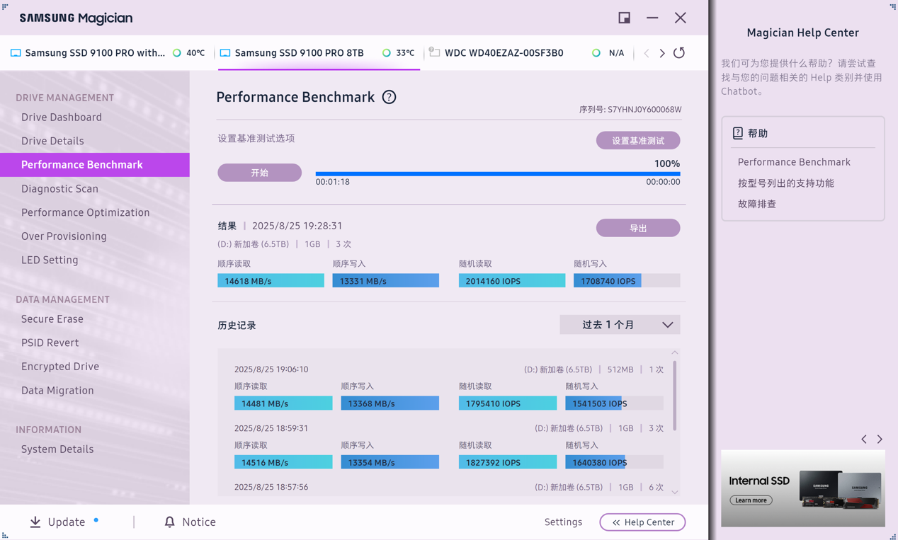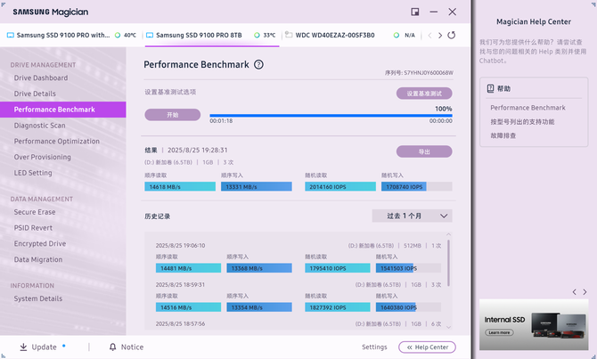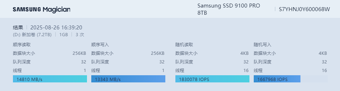 在三星 Magician 自带的Benchmark中对 9100 PRO 8TB 版本进行测试,其结果也相当亮眼:顺序读取速度高达 14810MB/s,顺序写入速度也达到了 13343MB/s,充分发挥了 PCIe 5.0 x4 接口的带宽潜能。与 CrystalDiskMark 的测试结果大致相同。