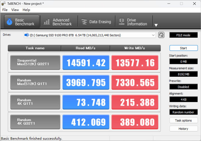 我们也测试了三星 9100PRO 8TB 版本在TxBENCH中的表现,顺序读写的成绩也与官方相近。