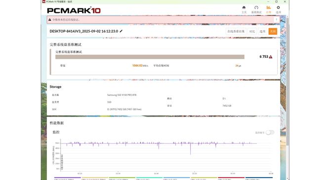 在PC Mark 10基准测试中,三星9100 PRO 表现同样出色。在完整系统盘测试中,获得了6753分的成绩,带宽达到1044 MB/s,平均存取时间仅为24 μs,体现出其在日常办公与大型软件处理场景下的稳定性能。
