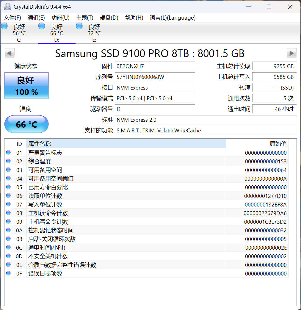 在高性能 SSD 的日常应用中,长时间高负载写入是最能检验产品稳定性与散热能力的场景。我们针对三星 9100 PRO 进行了连续写入测试,采用 CrystalDiskInfo 实时监控其温度表现。在模拟高强度数据写入场景下,在长时间满负载运行后,硬盘温度稳定在66°C且无降速情况发生。考虑到三星 9100 PRO 8TB 采用了双面 NAND 颗粒设计,这样的表现尤为亮眼,表明其内部结构与散热策略经过深度优化。这一特性对于基于 AI 应用的工作场景而言极具价值:无论是 AI 模型训练时海量数据集的持续导入与临时缓存写入,还是大语言模型(LLM)推理过程中高频次的参数调用与中间结果存储,抑或是多模态 AI 创作时大量临时文件的实时读写,三星 9100 PRO都能凭借稳定的高负载性能与出色的热控制,为 AI 工作流提供 “无中断” 的存储支撑。