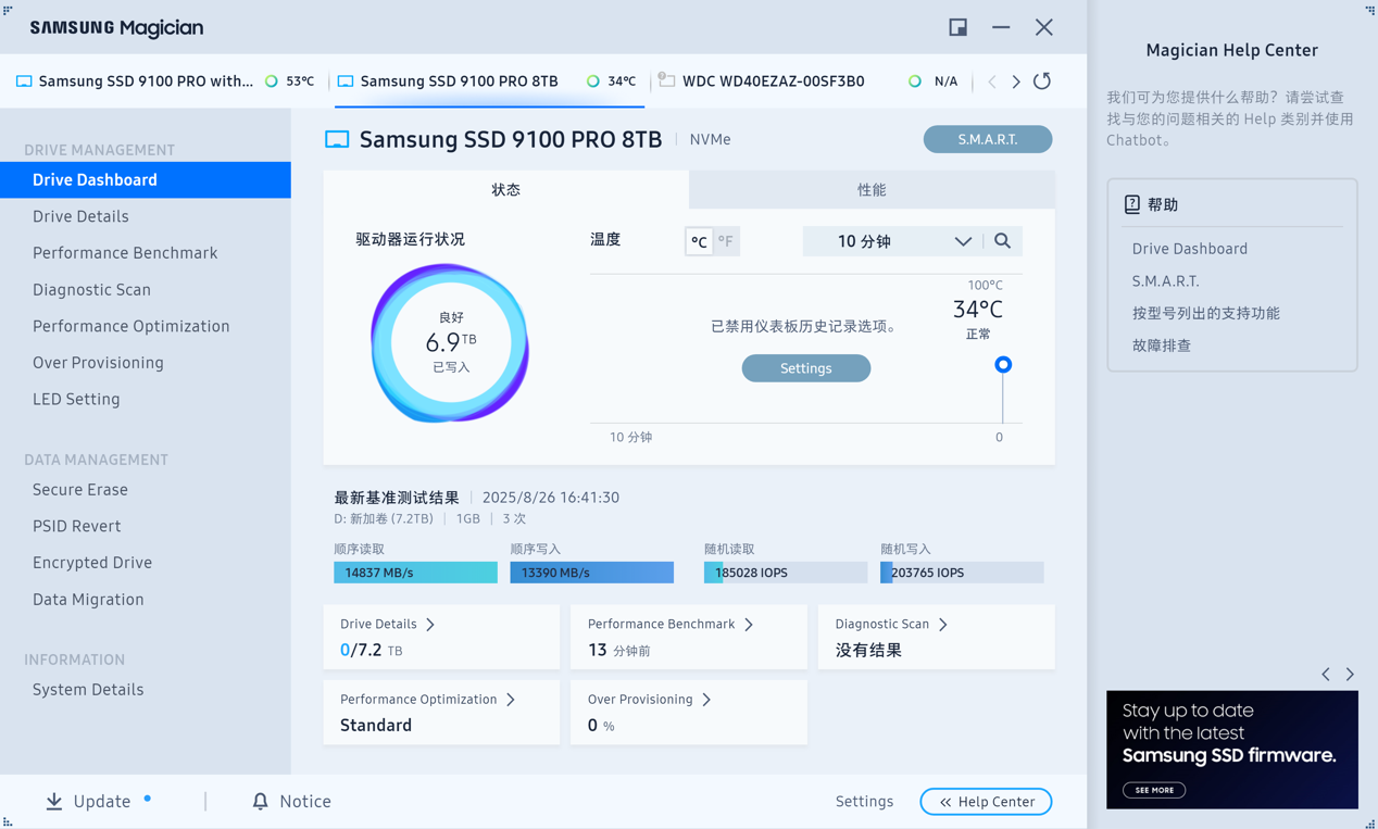 在 Driver Dashboard 界面,Magician 提供了直观的设备状态显示,帮助用户及时了解 SSD 的运行情况。通过“状态”选项卡,用户可以查看三星 9100 PRO 的剩余可用空间、已写入的总容量,以及实时工作温度等关键指标。同时,界面还提供简单的性能测速结果,用户无需额外安装第三方工具,即可掌握设备的性能状态,适合日常维护与健康检查。
