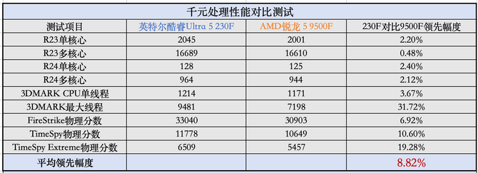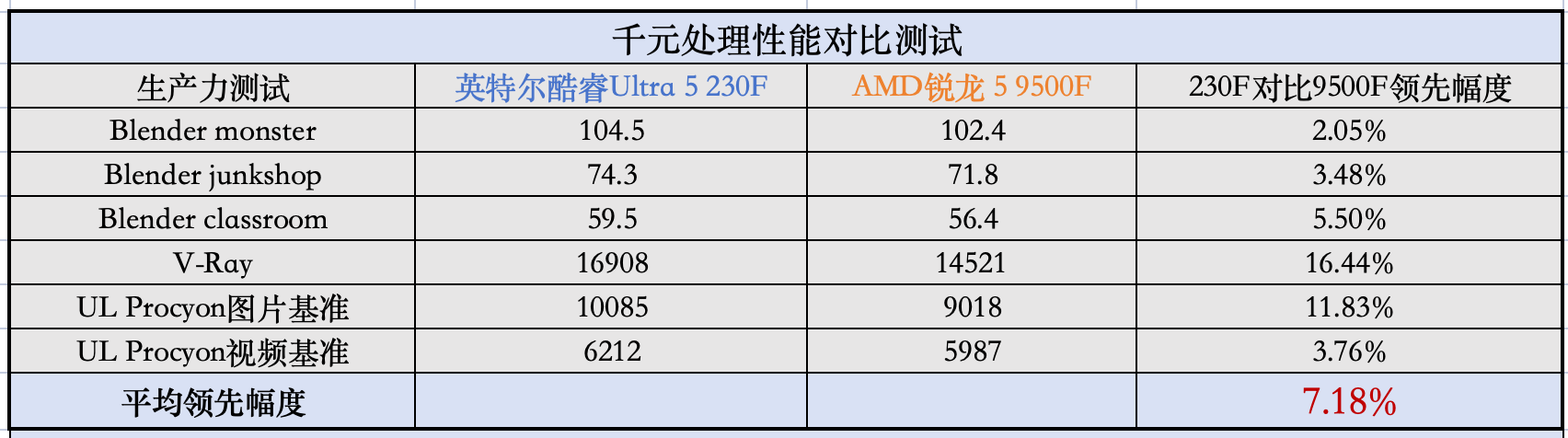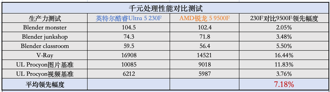 通过上面的实际测试的结果来看的话,我们能够清晰地看到,英特尔酷睿Ultra 5 230F的平均领先幅度依旧达到了7.18%,不论是后期的建模、渲染,还是图片、视频创作方面,英特尔酷睿Ultra 5 230F都能为内容创作者提供更强的性能表现。