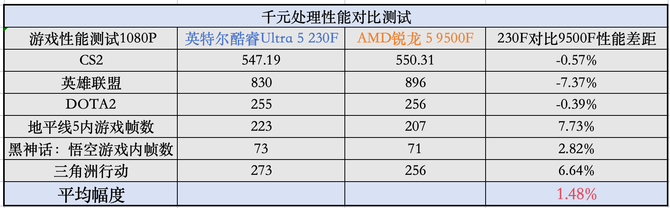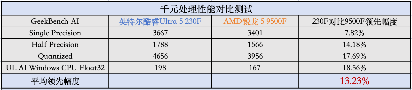 通过上面的实际测试可以看到,除了游戏性能英特尔酷睿Ultra 5 230F和9500F互有胜负之外,在基准、内容创作和AI性能表现上,是全面领先AMD锐龙5 9500F的,并且结合上目前两款处理器的100元差价,在千元级这个价位上,同样是同代的新品,英特尔酷睿Ultra 5 230F的表现明显更加全面。