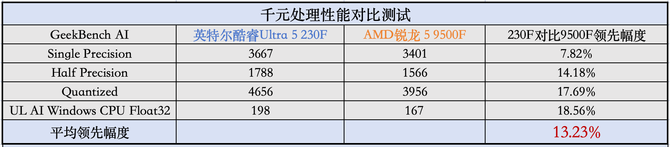 AI性能表现方面,我们选择GeekBench AI进行测试,可以看到酷睿Ultra 5 230F的AI算力方面表现出色,AI同样出色。