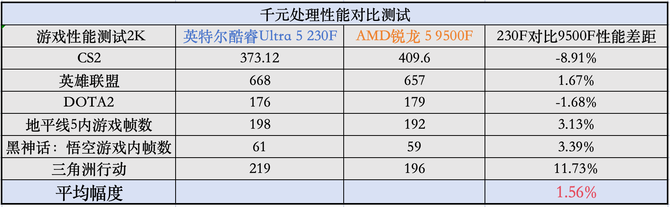 在2K游戏性能表现上,三角洲的游戏帧数领先11.73%,230F的综合领先幅度在1.56%,综合来看的话,酷睿230F配合上RTX 5070显卡,基本上能够通吃各类2K游戏。