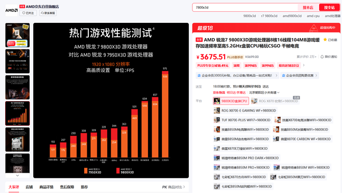 目前AMD 锐龙7 9800X3D处理器在京东自营旗舰店3C数码开学季的最新报价是3699元,京东PLUS会员到手更加优惠。成为京东旗舰店会员还有0元入会抽100元E卡,首购返666京豆和晒单抽AMD周边等活动。近期AMD 锐龙7 9800X3D处理器的价格在下调了200元之后都比较稳定,这样更能凸显出这款游戏神U的质价比了,近期准备攒机的DIY玩家值得最优先考虑。