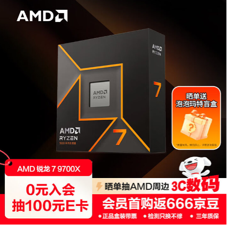 目前AMD 锐龙7 9700X处理器在京东自营旗舰店双十一促销预热阶段的最新报价是1999元,京东PLUS会员到手还能再优惠,成为京东旗舰店会员还有0元入会抽100元E卡,首购返666京豆和晒单送泡泡玛特盲盒还能抽AMD周边等活动。AMD 锐龙7 9700X处理器近期的价格已经来到了2000元以下,对于这样一款综合性能强劲的游戏处理来说真的非常超值,推荐大家随时入手。