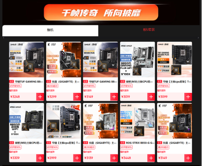除了爆品CPU单品之外,活动页面有很多AMD锐龙处理器的板U套装和卡U套装,这些结合了AMD和合作伙伴芯片组产品和显卡产品的套装不仅搭配起来相得益彰,套装价格更是优惠,方便大家一站购全想要的硬件产品。