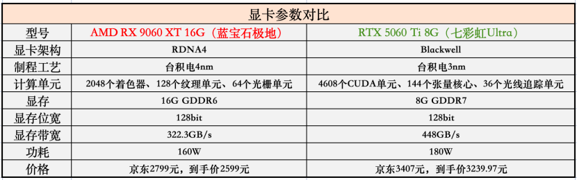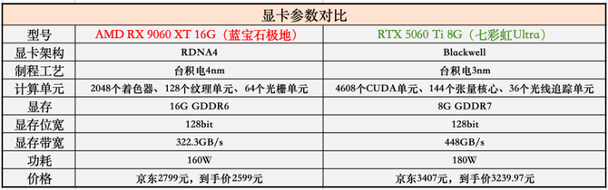 参数规格方面,由于技术特性不一致,没办法直接进行对比,但是作为主流级的显卡,显存容量方面,AMD RX 9060 XT 16G的容量更高,并且显卡的功耗更低,后面的价格方面,也能够看到,AMD RX 9060 XT 16G目前京东自营的实时价格为2599元,而RTX 5060 Ti 8G的价格为3239.97元,这还是叠加了京东PLUS会员价格,如果你有时间在多多或者其他电商平台进行搜索的话,到手的价格肯定是要比上面的表格要低的,但是从差价来看,RTX 5060 Ti 8G的价格要贵了640多元。