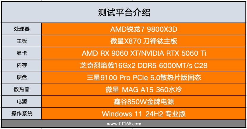 测试平台方面,我们使用了AMD锐龙7 9800X3D进行测试,可以看到除了显卡不一致之外,其余的硬件部分也是保持一致的,并且在测试的选项上面,我们也是保证测试的项目设置保持一致,下面我们就来看看实际的测试结果。