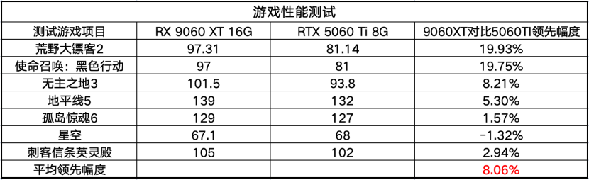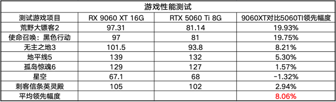 实际的游戏性能测试部分,我们看到在2K分辨率下,相同的特效下,我们选择了7款游戏进行测试,其中AMD RX 9060 XT 16G的游戏性能领先幅度至高来到了19.93%,平均游戏性能领先达到了8.06%,性能领先非常明显。