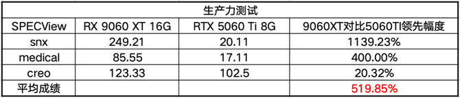 生产力部分的话,我们选择了SPECView进行测试,其中的重点的几个测试项目也能看到,AMD RX 9060 XT 16G的平均领先幅度来到了519.86%,性能表现非常出色,可以说是断崖式的领先,并且领先幅度最大的snx测试项目,已经实现了1139%的10倍领先,性能表现非常优秀。