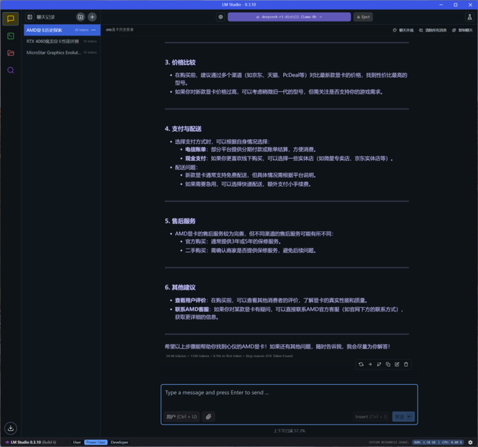 后续我们还使用了LM Studio测试两款显卡的本地AI语言模型支持的能力,其中AMD RX 9060 XT的性能来到了54.46Token/s的生成速度,而RTX 5060 Ti 8G的生成速度则仅为42.12Token/s,相比较之下,对于有本地大语言模型训练的小伙伴来讲,选择AMD RX 9060 XT 16G的显存更大,运算效率更快,带来更高效的使用体验。