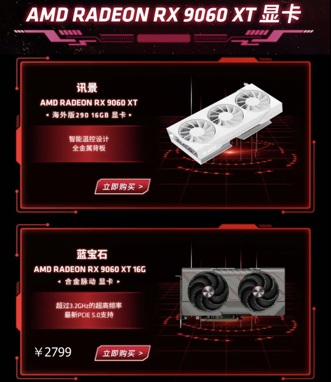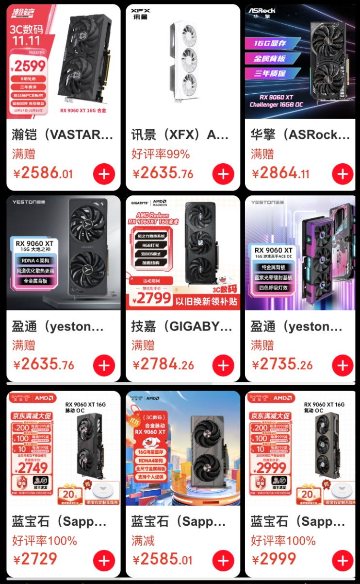 性能全方位领先,价格还更低,功耗也更优秀,比较下来,相信你已经知道该选择哪款了!现在,正值11.11大促活动之中,正是购入新装备的最佳时机!AMD京东官方旗舰店多项活动好礼已经准备就绪。显卡方面:蓝宝石、讯景、华硕、瀚铠等一线大品牌全线就位。RX 9060 XT则搭配整机售卖,活动期间,可享至高补贴2000元!晒单可再享50元E卡返现。机会有限,先到先得!