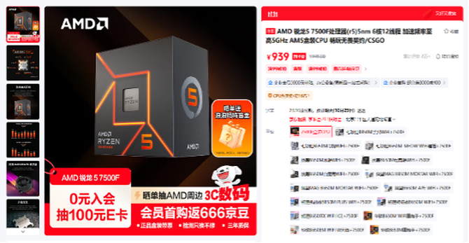 目前AMD 锐龙5 7500F处理器在京东商城自营旗舰店的报价是949元,京东PLUS会员到手还能更加优惠,成为京东旗舰店会员还有0元入会抽100元E卡,首购返666京豆和晒单抽AMD周边等活动。对于想要选购一款可以战未来的入门级游戏处理器来说,千元之内的预算,AMD 锐龙5 7500F处理器绝 对是大家的唯一选择,趁着京东11.11大促期间入手更加划算。