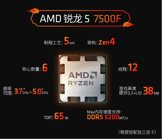 AMD 锐龙5 7500F处理器采用了5nm制程工艺打造的ZEN4架构,配备了6核心12线程的核心配置,5.0GHz的最高加速频率以及38MB的游戏缓存,纯大核设计高频强核才更加适合电竞玩家。而仅仅65W的功耗同时还赠送幽灵散热器,无需额外预算搭配水冷即可使用。处理器支持PCIe 5.0和DDR5内存,AM5平台使用周期可达2027年+,大家可以放心战未来。