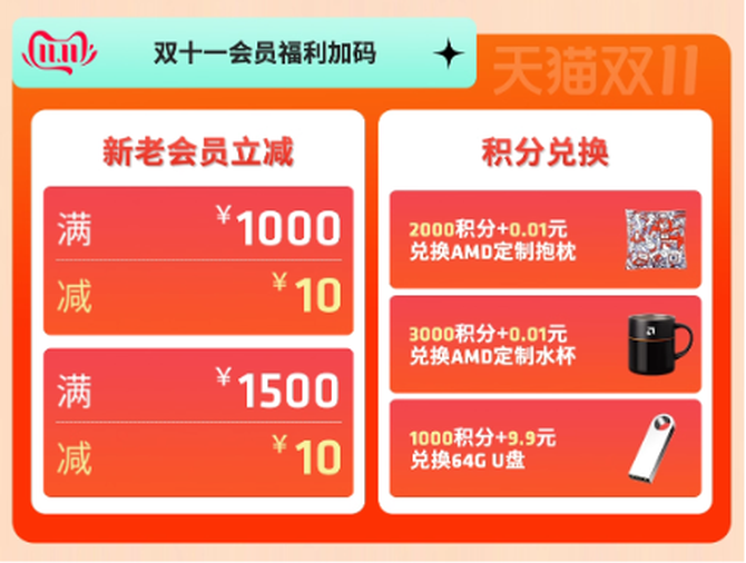 首先来介绍一下AMD(超威)官方电脑旗舰店双十一会员福利,新老会员可享满1000立减10元,满1500立减10元以及满5000-50元的限量优惠券,下单后可以领取会员积分,积分可以兑换AMD定制抱枕,定制水杯以及64G U盘。双十一享受30天价保,全店3期免息,部分商品12期免息。下面为朋友们推荐几款整机和板U套装,都是AMD和合作伙伴共同推出的产品,相信可以满足大家各种的硬件采购需求。