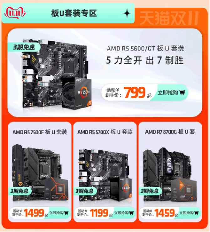 当然活动页面还有更多整机、板U套装可选,也涵盖了AMD锐龙全系列处理器,建议朋友们前往AMD官方电脑旗舰店活动页面选购,限时优惠分期免息还有购买之后送的会员积分抽AMD周边,在双十一期间焕新自己的电脑平台真的是最明智的选择,感兴趣的DIY用户赶快前往下方链接选购吧。
