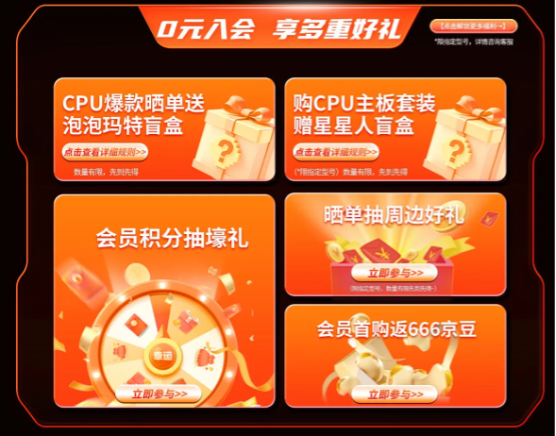 参与AMD京东自营旗舰店11.11开门红促销的朋友们,建议先要成为AMD京东自营旗舰店的会员,加入会员之后就可以解锁一系列的福利了,CPU爆款晒单送泡泡玛特盲盒,购CPU主板套装赠星星人盲盒。会员晒单还可以抽周边好礼,会员首购返666京豆,会员积分还能再抽壕礼,满满的福利已经备好。特别提示一下朋友们,今晚20点之后来到活动页面,CPU单品的价格都会有限时直降,届时大家发现收藏夹和购物车里心仪的处理器降价的话就赶快下单吧。