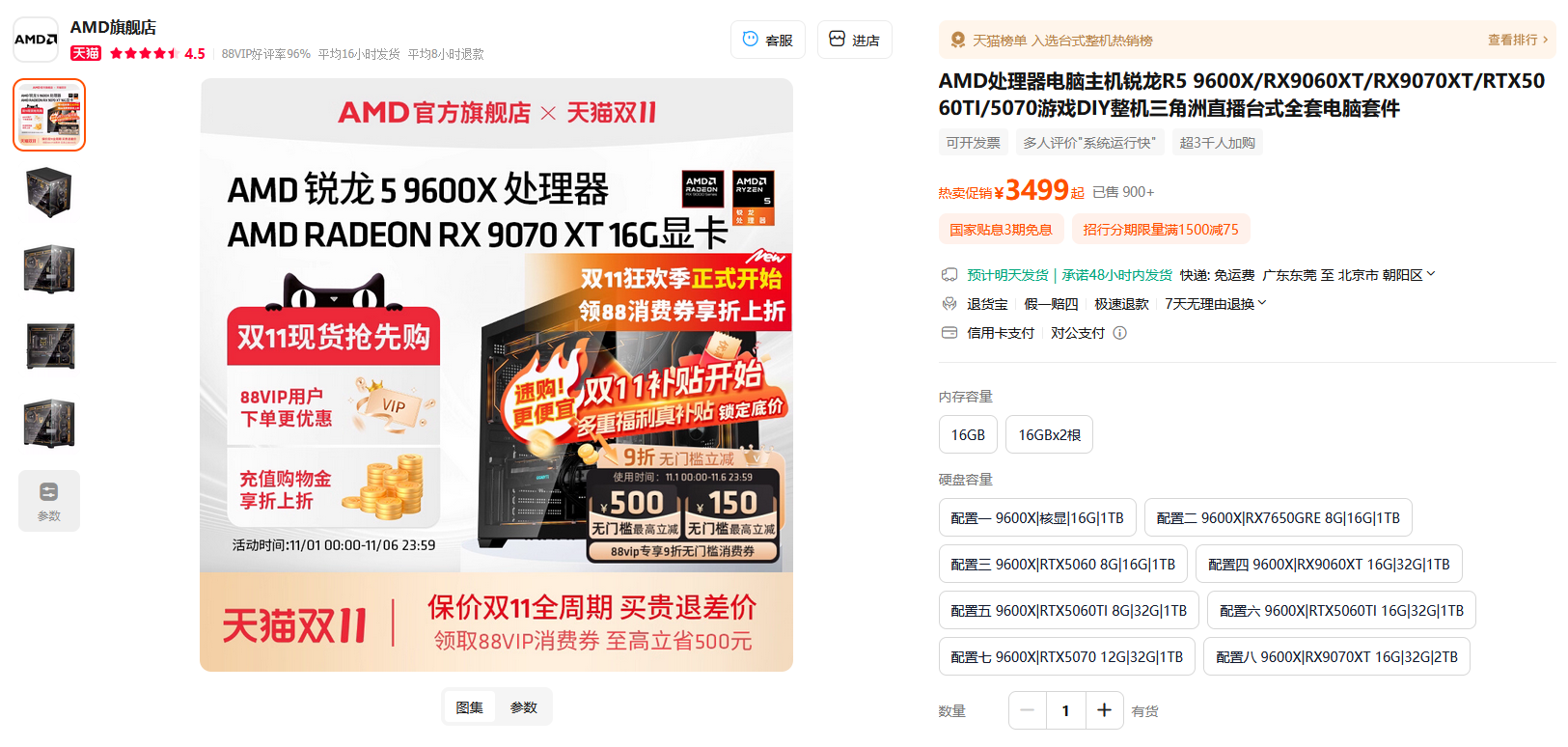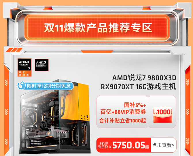首先还是来介绍一下AMD(超威)官方旗舰店双十一会员福利,新老会员可享无门槛9折消费券,88VIP满5000立减500元以及1500-150元的限量优惠券。购物金多充多送,双十一享受30天价保,部分商品12期免息。接下来就开始推荐爆款主机,需要大家注意的是,这些产品的到手价格请以实际页面为准,很多福利活动限时限量,不清楚建议咨询下在线客服。