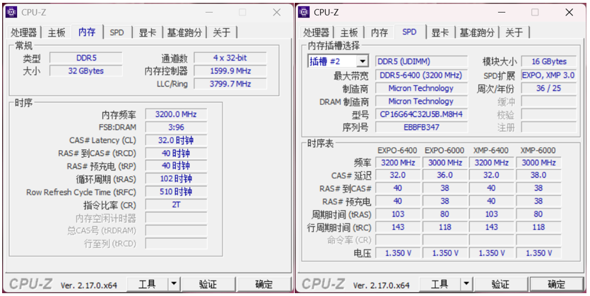CPU-Z 是一款小巧而强大的系统检测软件,它能够提供详细的 CPU、内存、主板等硬件信息。在本次评测中,通过 CPU-Z 可以显示 Crucial 英睿达 DDR5 Pro 6400 内存的关键信息,包括内存支持的 Intel XMP 3.0 和 AMD EXPO 技术,以及 32 - 40 - 40 - 103 的时序和 1.35V 的内存电压等参数。