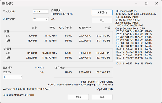 7-Zip 是一款常用的数据压缩与解压缩软件,其内置的基准测试功能能够很好地检验内存套件的性能,不仅能够体现内存的原始带宽,还能反映内存的响应速度。7-Zip 的基准测试结果达到162.138 GIPS的总体评分。