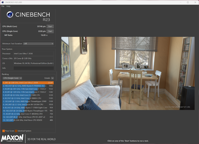 CINEBENCH R23的测试中,单核成绩2228pts,多核成绩35748pts。