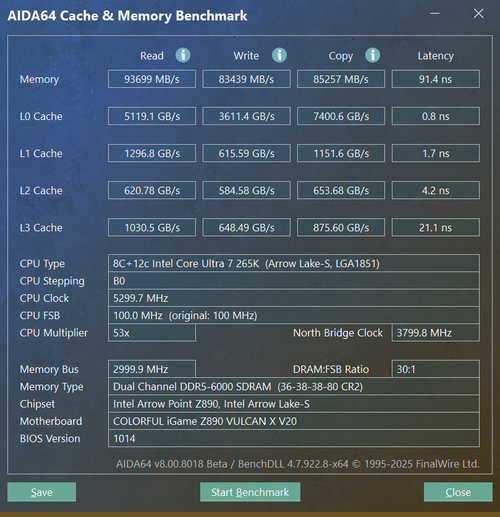 在AIDA64的内存测试中,读取速度 93699 MB/s,写入速度 83439 MB/s,Copy 速度 85257 MB/s,时延 91.4ns。相比在6400速度下,均有下降。